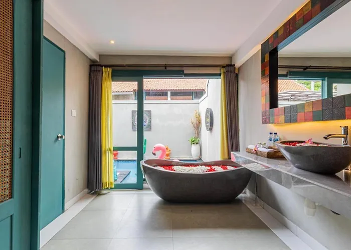 De 1-slaapkamer Mezzanine Industrial 1 Bedroom Private Villa In Seminyak bevindt zich op sechts 6 minuten te voet van de Métis Galerie & Boetieks en biedt gemakkelijk toegang tot attracties in de omgeving. In de villa, in de buurt van de F45 Seminyak, kunnen gasten genieten van een bubbelbad, evenals een privézwembad.
